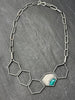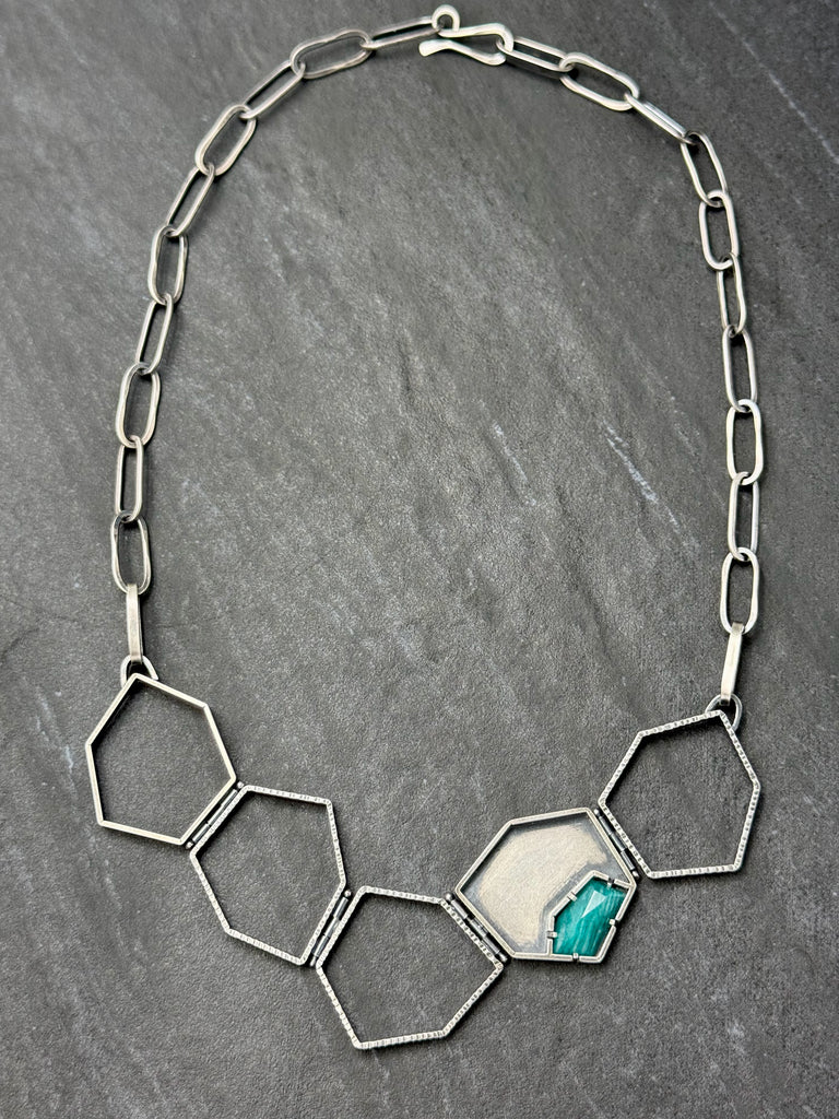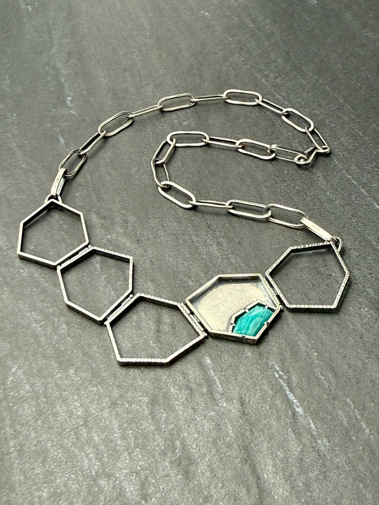 Balanced asymmetry is a hallmark of ESB designs. The rich color of the amazonite combines so beautifully with the oxidized silver. Each element is hinged to the next in the focal point of this necklace creating nice movement and wearability.