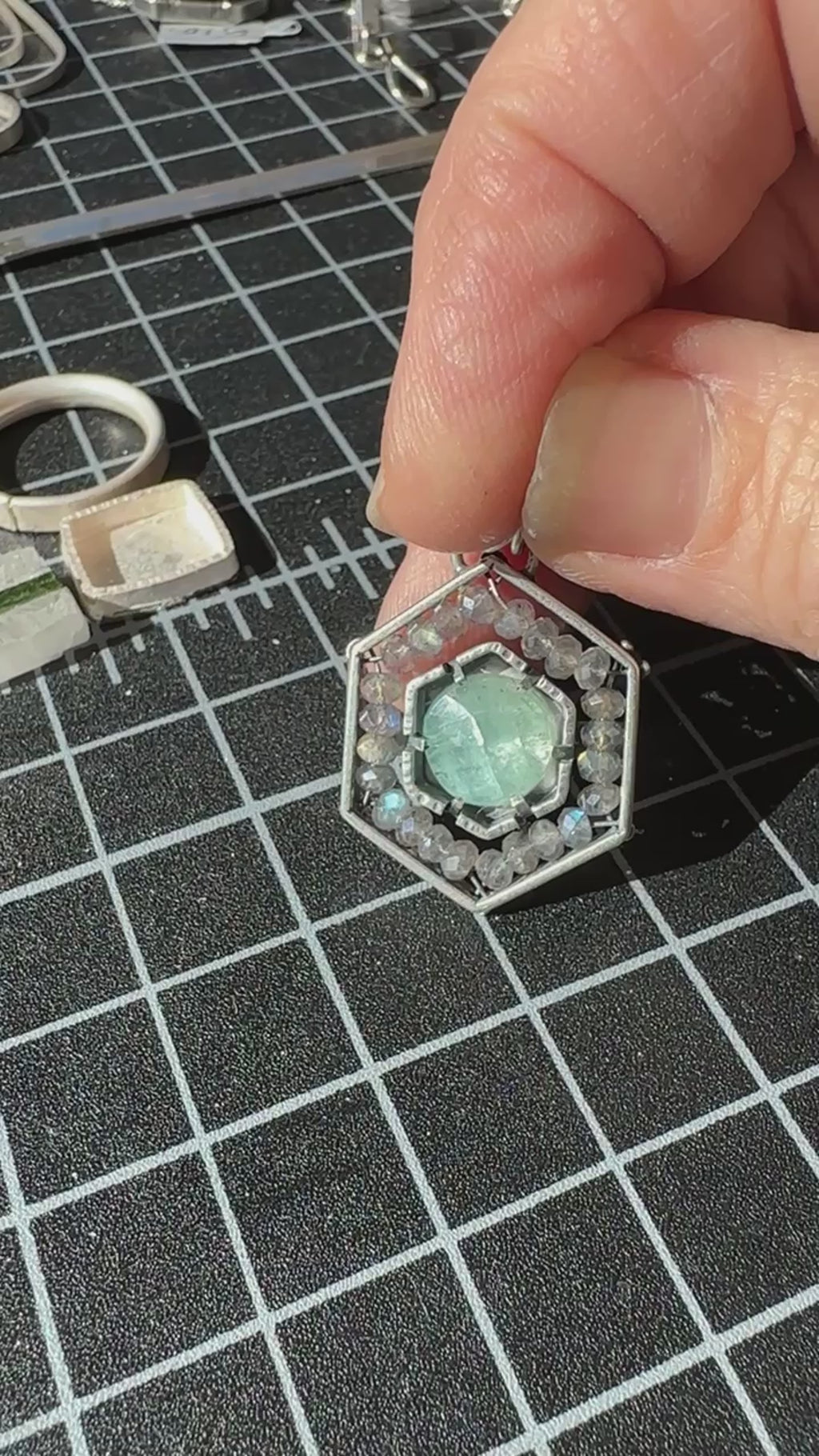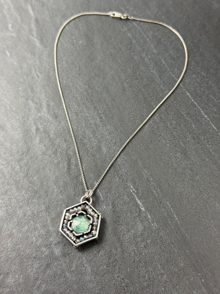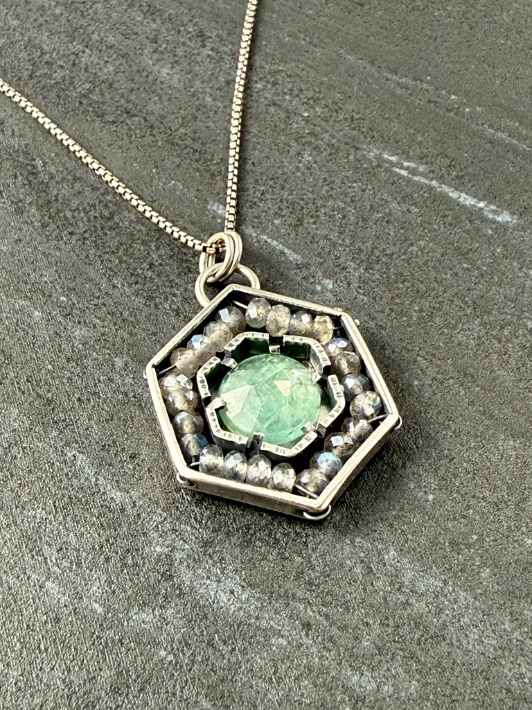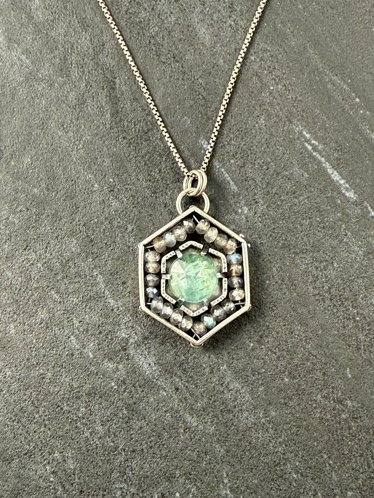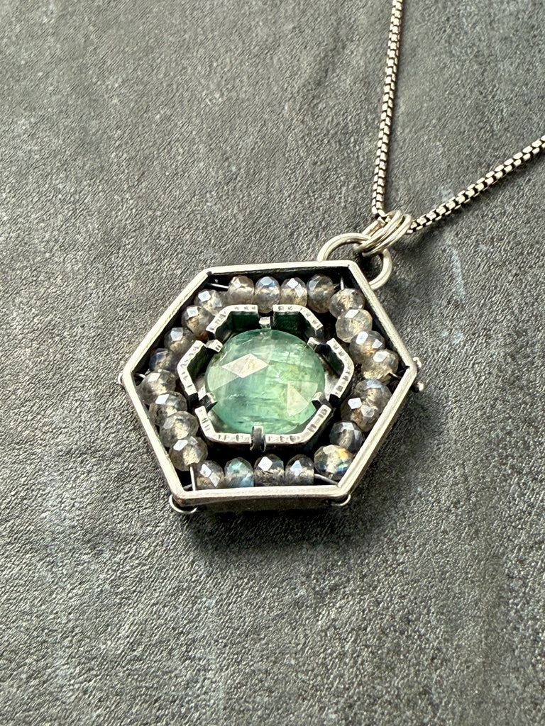 Kyanite & Labradorite in oxidized sterling silver pendant.Chain is not included. We have a variety of chains available for purchase. Two options that would work beautifully with this pendant are Rounded Box and Rolo1.25" X 0.9"Weight 0.2 oz