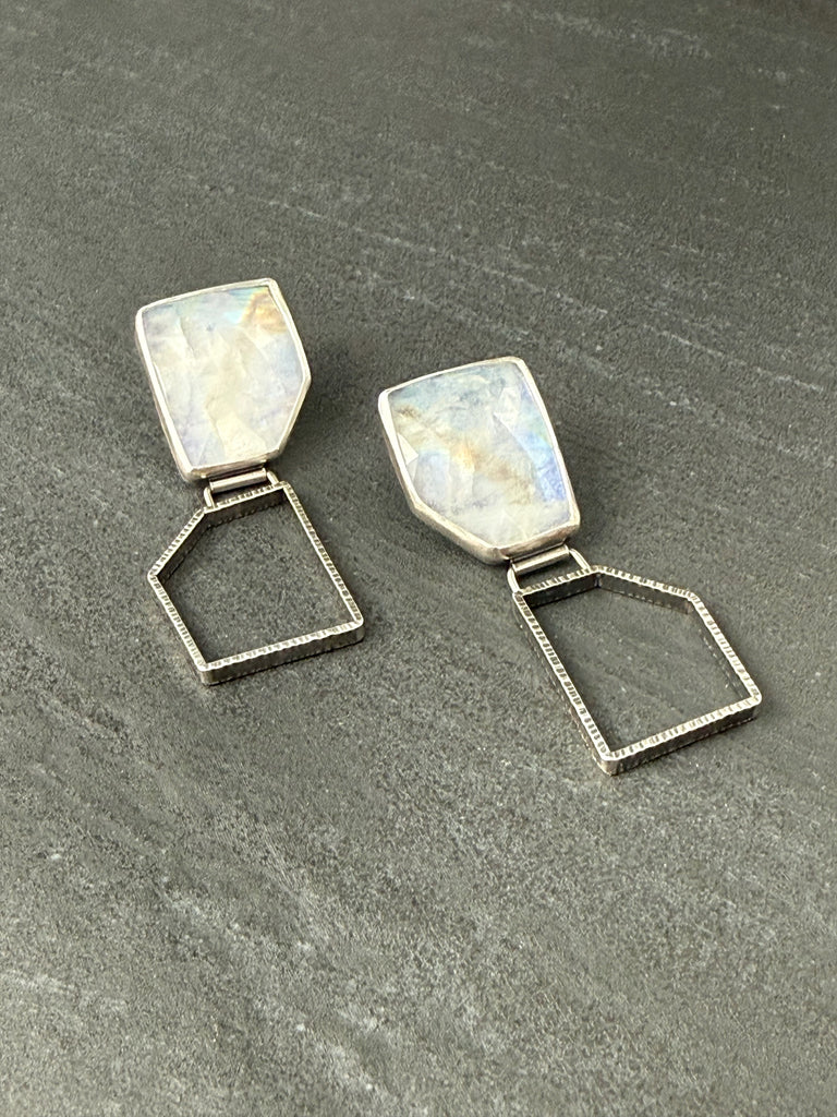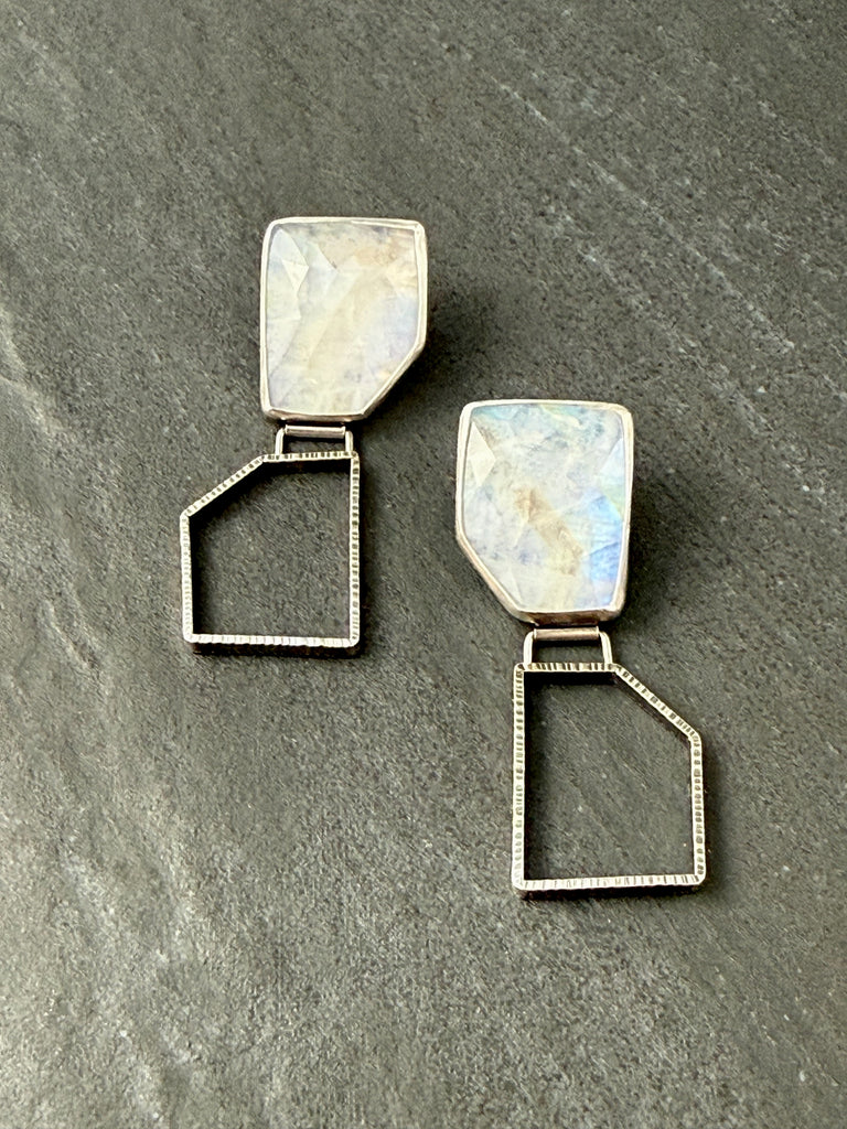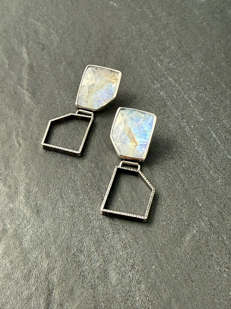 Faceted Rainbow Moonstone and oxidized sterling silver post earringsOne of a Kind2.1" x 1"Weight 0.6 oz/pair