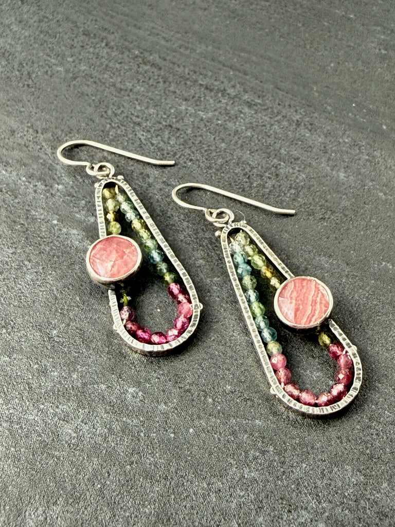 Watermelon Tourmaline & Rhodochrosite in oxidized sterling silver earringsOne of a Kind1.9" x 0.5"Weight 0.2 oz/pair