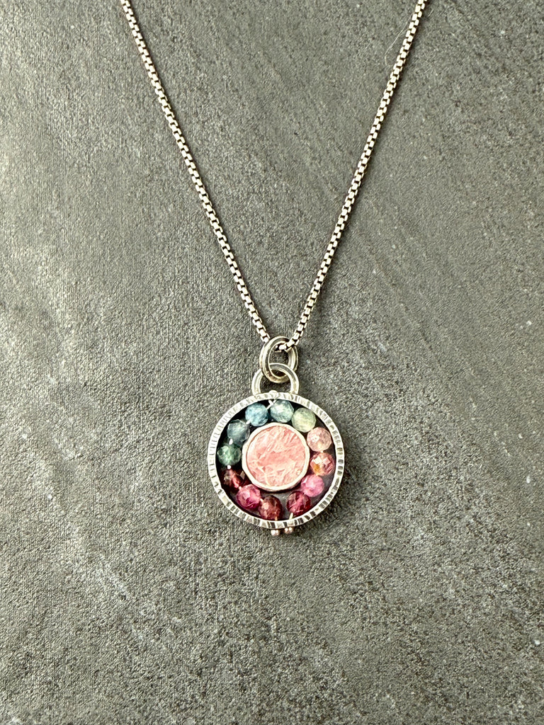 Watermelon Tourmaline & Rhodocrosite in oxidized sterling silver pendant in a seignature ESB "geode" design