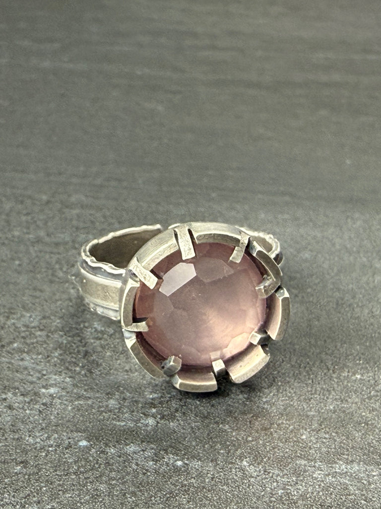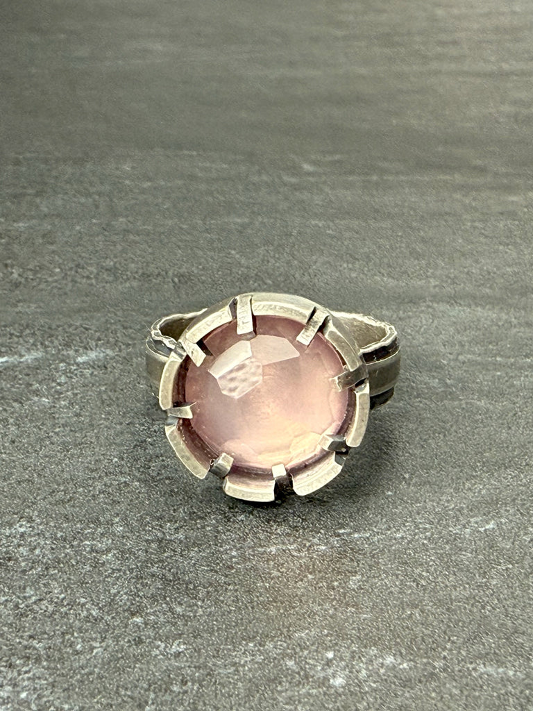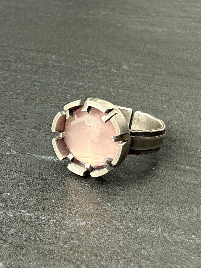 Rose Quartz & oxidized sterling silver ringOne of a KindAdjustable size , please email Erica with desired size after purchase, max size 9Weight 0.3 oz